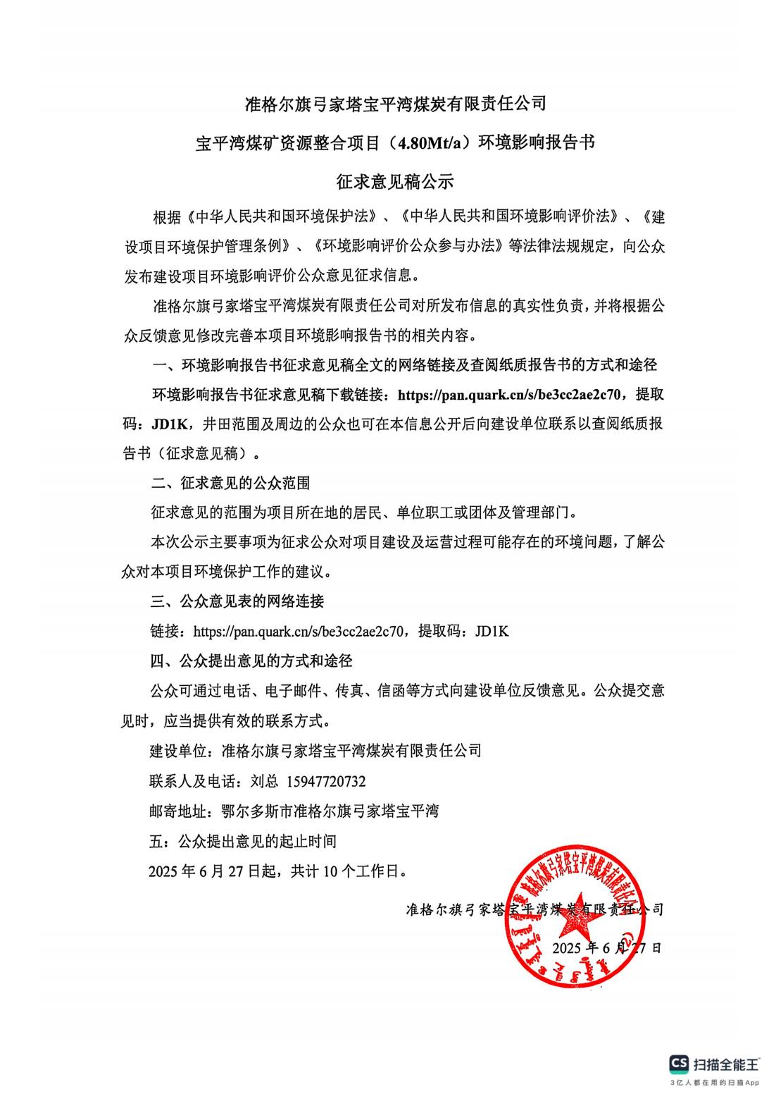 寶平灣煤礦環評征求意見稿